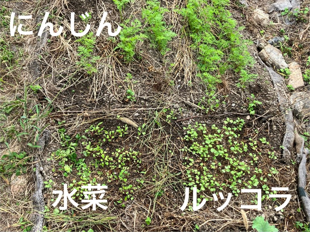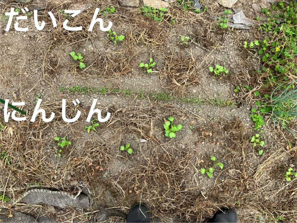 ダイコンもテン蒔きしたすべてのスポットで発芽し、間に蒔いたにんじん(こちらは購入した種)もしっかりと発芽してくれました。